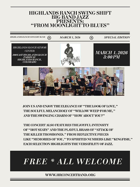Highlands Ranch Concert Band started in 2001 and is a committed group of amateur to professional musicians dedicated to entertaining the South Denver metro community. We are made up of a Concert Band of 80 musicians and an 18-piece big band, Swing Shift.